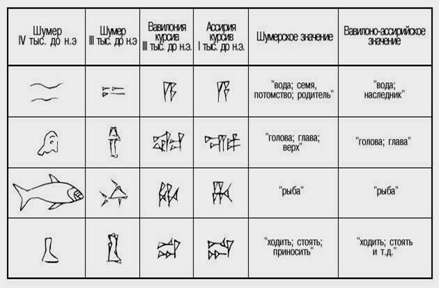 Древнейшие письменные знаки, которые наряду с клеймами первоначально служили для обозначения права собственности на тот или иной предмет и поэтому вырезывались на печатях, с течением времени образовывали сложную картинно-слоговую письменность. Вызванная условиями жизни необходимость быстро написать документ привела уже в глубокой древности к упрощению картинной письменности шумерийцев: вместо того, чтобы нарисовать весь предмет, стали изображать лишь его наиболее характерную часть, превращая ее в линейную схему. Применение скорописи и специфика начертания знаков на глиняных табличках привели к дальнейшей схематизации знаков и к выработке системы клинописи. Знаки выжимавшиеся на мягкой глине, теряли свой прежний картинный облик и постепенно принимали свой прежний картинный облик и постепенно принимали форму различных сочетаний из вертикальных, горизонтальных и косых клиньев (см. Приложение II).