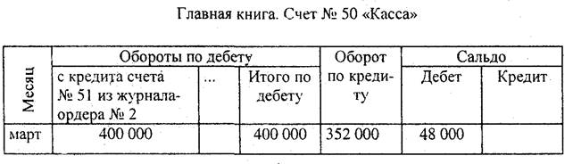Каждый журнал-ордер является одновременно и, мемориальным ордером (бухгалтерской проводкой). Итоговые данные журналов подлежат записи в Главной книге, в, которой каждому счету отводится одна страница, причем записи делаются только по дебету каждого счета с указанием корреспондирующего счета по кредиту. По Главной книге выводится сальдо по каждому счету и составляется сальдовый баланс на начало следующего месяца. Оборотный баланс можно не составлять, так как отраженные в нем данные можно видеть в Главной книге.
