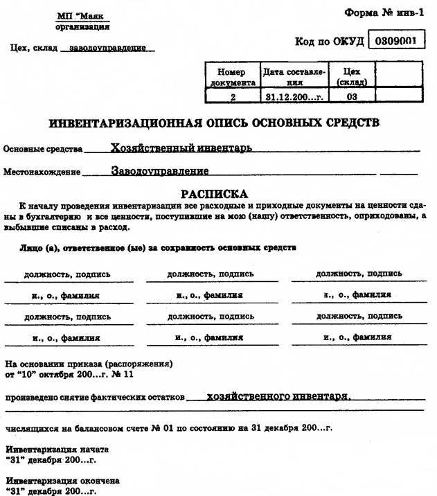 Хотя материально ответственное лицо является членом комиссии, но заполнять инвентаризационную опись ему запрещено. Материально ответственное лицо дает первоначальную расписку о том, что все документы им сданы в бухгалтерию, и расписку после инвентаризации о том, что все ценности комиссией проверены в его присутствии, внесены в опись и претензий к инвентаризационной комиссии нет. Эти расписки напечатаны типографским способом на самих бланках инвентаризационной описи.