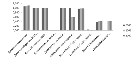 По результатам проведенной оценки имущественного положения в части бюджетных средств можно сказать, что стабильный финансовый коэффициент в 2005-2007г. занимает доля ОС в составе НФА и доля внеоборотных НФА в составе имущества: в 2005г. - 0,980; в 2006г. – 0,982, в 2007г. – 0,984.