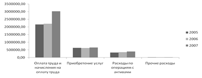 3) Преобладание расходы на оплату труда и начисления на оплату труда в структуре расходов: 58% – в 2005 г., 59% – в 2006 г. 56% – в 2007 г.