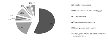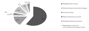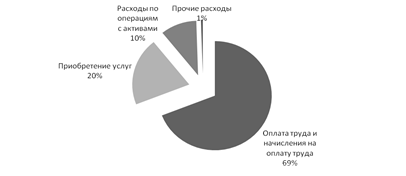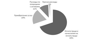 Расходы на оплату труда и начисления на оплату труда составляют 69%, прочие расходы - 1 %,приобретение услуг - 19% , расходы по операциям с активами – 11% в общей структуре расходов.