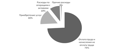 Расходы на оплату труда и начисления на оплату труда составляют 74%, прочие расходы - 1%, приобретение услуг-16% , расходы по операциям с активами – 10% в общей структуре расходов.