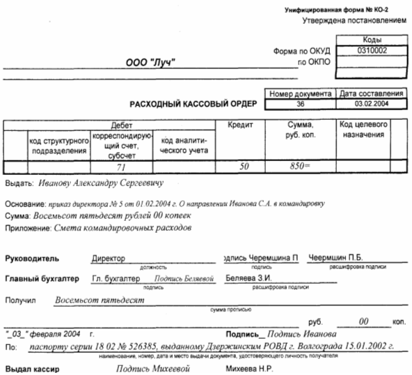 Выдача наличных денег из касс предприятий производится по расходным кассовым ордерам (форма № КО-2) или надлежаще оформленным другим документам (платежным (расчетно-платежным) ведомостям, заявлениям на выдачу денег, счетам и др.) с наложением на эти документы штампа с реквизитами расходного кассового ордера. Документы на выдачу денег подписываются руководителем и главным бухгалтером предприятия. (информация взята из Положения о бухгалтерии ООО «Луч»).