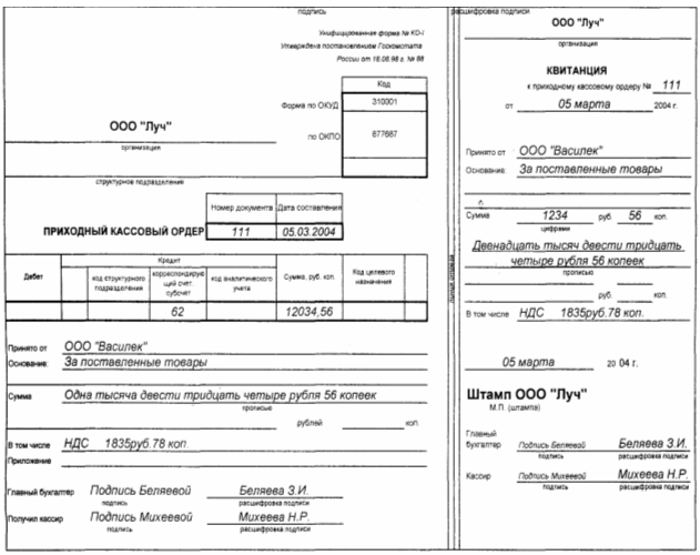 Категорически запрещено выдавать приходные кассовые ордера на руки лицам, вносящим деньги. Приходный кассовый ордер бухгалтер непосредственно передает для исполнения в кассу, где кассир проверяет правильность оформления и полноту заполнения ордера, наличие и подлинность подписи главного бухгалтера. В случае несоблюдения одного из этих требований кассир возвращает документы в бухгалтерию для надлежащего оформления. Затем принимает деньги, подписывает приходный кассовый ордер и квитанцию. В подтверждение сдачи денег, кассир отрывает квитанцию от приходного ордера и вручает лицу, внесшему деньги. На квитанции должен стоять штамп кассира “Получено” для физических лиц или печать предприятия для юридических лиц, или оттиск кассового аппарата, если он имеется в организации и подписи кассира и гл. бухгалтера.