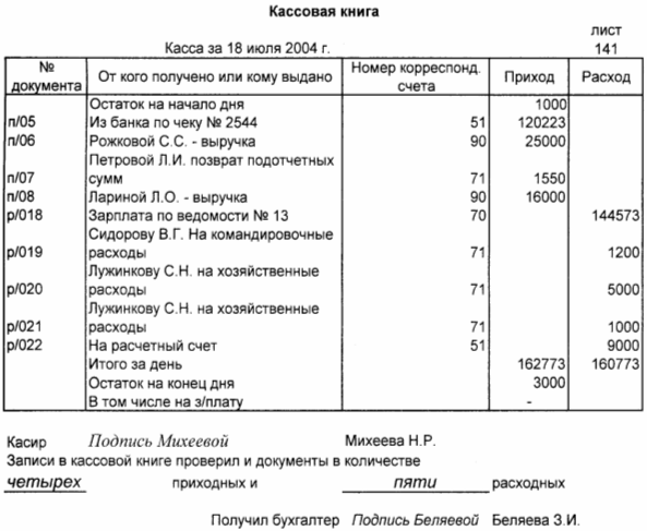 При получении или выдаче денег по каждому кассовому документу кассир делает записи в кассовую книгу (форма 1 КО-4). Каждая организация ведет только одну кассовую книгу. Эта книга должна быть прошнурована и опечатана печатью организации, страницы в ней должны быть пронумерованы. Записи в кассовой книге обычно производятся кассиром в двух экземплярах через копировальную бумагу сразу после получения или выдачи денег по каждому ордеру или документу. Ежедневно в конце дня кассир подсчитывает итоги операций за день по графам приход», выводит остаток (сальдо) по кассе, и переносит его на следующий лист на первую разницу по графе «приход». Внизу каждого листа кассир указывает количество приложенных приходных и расходных кассовых ордеров и расписывается.
