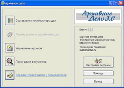 Система "АРХИВНОЕ ДЕЛО" - новая разработка компании "Электронные Офисные Системы" (ЭОС). "АРХИВНОЕ ДЕЛО" - это тиражируемый продукт, реализующий функции архива организации, а также функции делопроизводственных служб в части формирования и оформления дел.