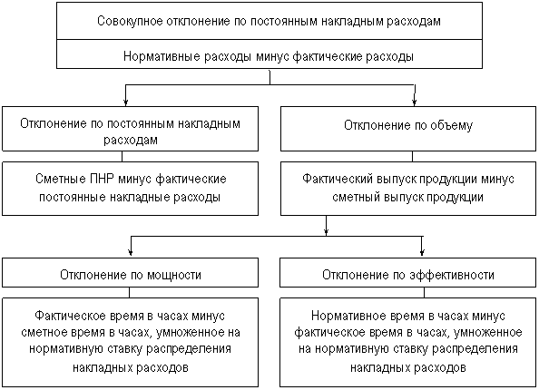 Постоянные производственные накладные расходы включаются в состав производственной себестоимости продукции в полном объеме только в случае, когда фактический объем производства равняется или превышает нормальную мощность. Отклонение по постоянным накладным расходам, таким образом, будет характеризовать различие между нормативными и фактическими постоянными накладными расходами.