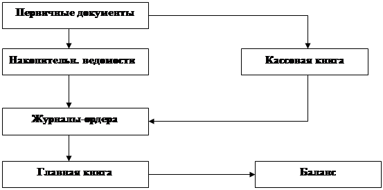 На предприятии применяется журнально-ордерная система учёта. (приложение 1). Первичные документы обрабатываются с применением вычислительной техники. Для отражения материальных ценностей, денежных средств применяются синтетические регистры бухгалтерского учёта: ведомости, журналы-ордера, книги, оборотные ведомости, главная книга.