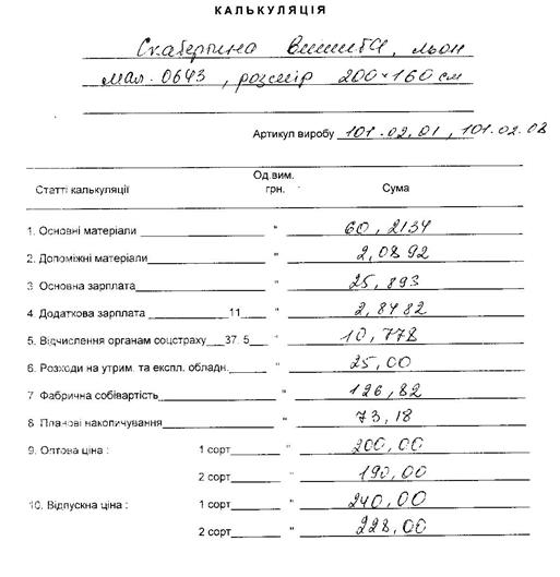 Всього затрати склали -4643,52 грн. на виготовлення 325 одиниць продукції рушник «Хліб-сіль», тобто собівартість одного рушника складає: