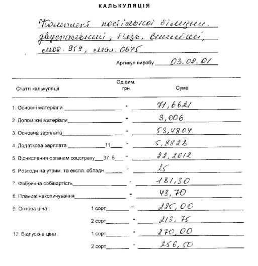 Підрахунок собівартості комплекту постільної білизни, двоспальний (малюнок 0645) артикул 03.02.01.