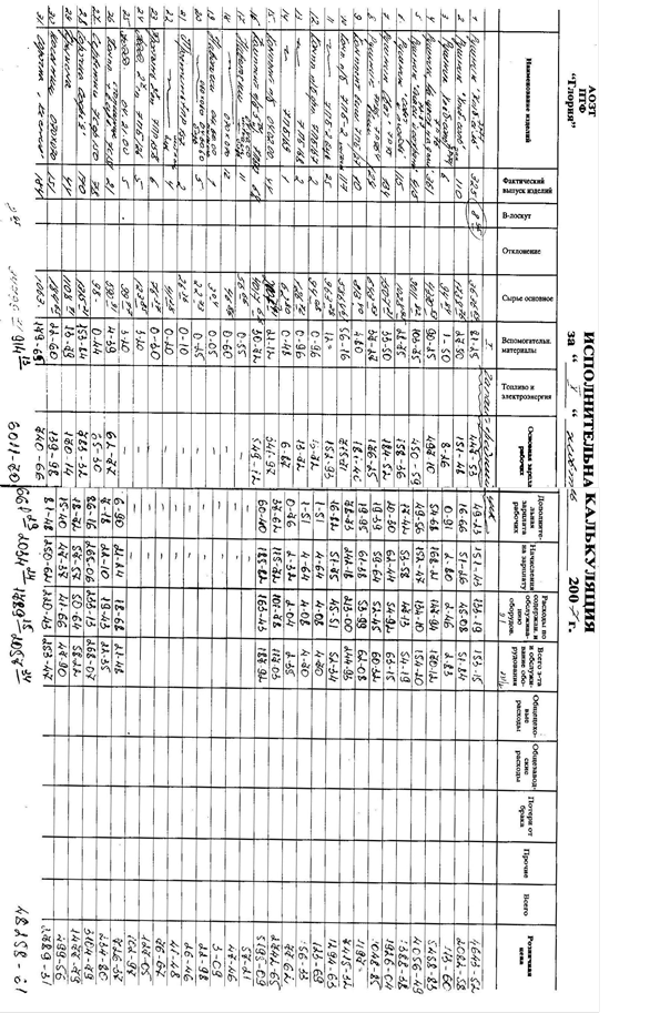 У виконавчій калькуляції зазначено усі витрати на виробництво продукції галантерейного цеху за місяць. У ній підраховано загальну кількість випущеної продукції та підраховано витрати на кожен вид продукції по кожній статті окремо та загалом а також загальні витрати на всю продукцію по кожній продукції за місяць. Наприклад: