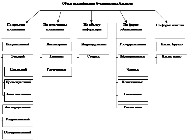 Бухгалтерские балансы можно классифицировать по следующим признакам: по времени и источникам составления; по объему информации; по форме собственности и очистки. Общая классификация бухгалтерских балансов представлена на рис.4.