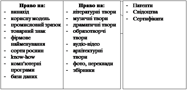 1. об'єкти права інтелектуальної власності - до них відносять: право власності на винахід, на корисну модель, на промисловий зразок, на сорт рослин, а також: право власності на фірмове найменування, право власності на програмне забезпечення і бази даних для ЕОМ, на науково-технічну інформацію; засвідчуються патентом;