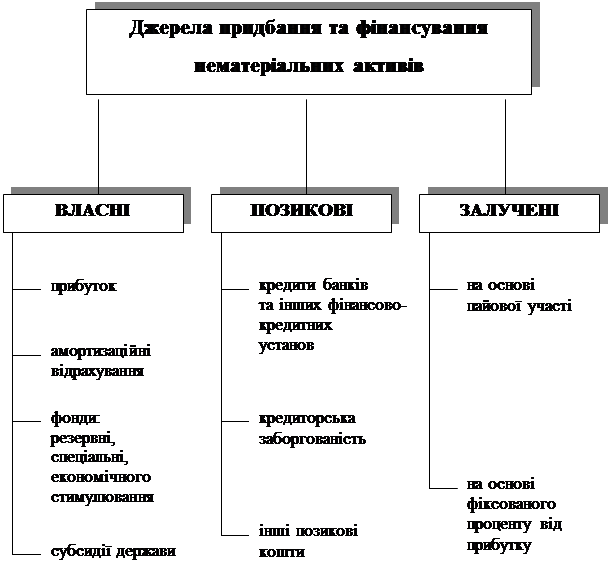 Класифікація джерел придбання і фінансування нематеріальних активів показана у вигляді схеми на рисунку 1.2. Як видно з рисунку, вони можуть бути власними, позичковими та залученими.