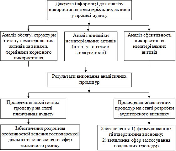 Виконання аналітичних процедур у процесі аудиту підприємств має формальний характер і не документується, що зумовлює проблеми, пов'язані з витратами часу на проведення аналізу та відсутністю договірної ціни результатів здійсненого аналізу. Крім того, це спричинює питання похідного характеру щодо мети, завдань та джерел інформації аналізу використання нематеріальних активів.