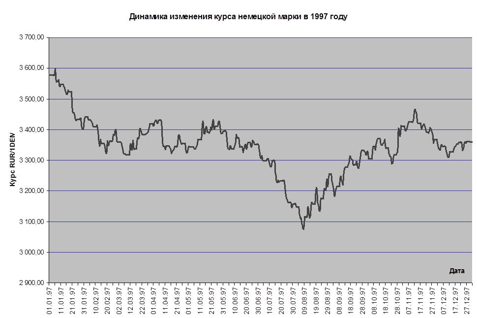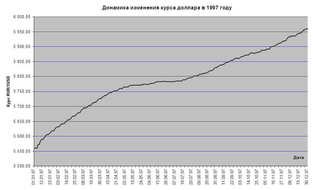 Начиная с 1995 года и по настоящее время Правительством РФ и Центральным Банком РФ, проводится политика, направленная на обеспечение стабильности национальной валюты, повышение конкурентоспособности отечественной промышленности на внутреннем и международном рынках, создание условий для привлечения иностранных инвестиций и «дедолларизацию» экономики страны. Помимо развития и укрепления законодательной базы, на каждый год определяется область изменения официального курса рубля путем установления официального курса российского рубля к иностранным валютам, основанного на ежедневных котировках Банка России. При этом Банк России ограничивает колебания валютного курса на биржевом и межбанковском валютном рынках, устанавливая официальный валютный курс и курсы покупки и продажи валюты по операциям Банка России в определенных пределах (от 5500 и 6100 рублей за доллар США на 1 января 1997 г. до 5750 и 6350 рублей за доллар США на 31 декабря 1997 г.) Данный механизм регулирования курсов иностранных валют основан на гарантированной возможности беспрепятственной покупки и продажи иностранной валюты на внутреннем валютном рынке в рамках действующего законодательства и мерах бюджетной, денежно-кредитной и валютной политики.