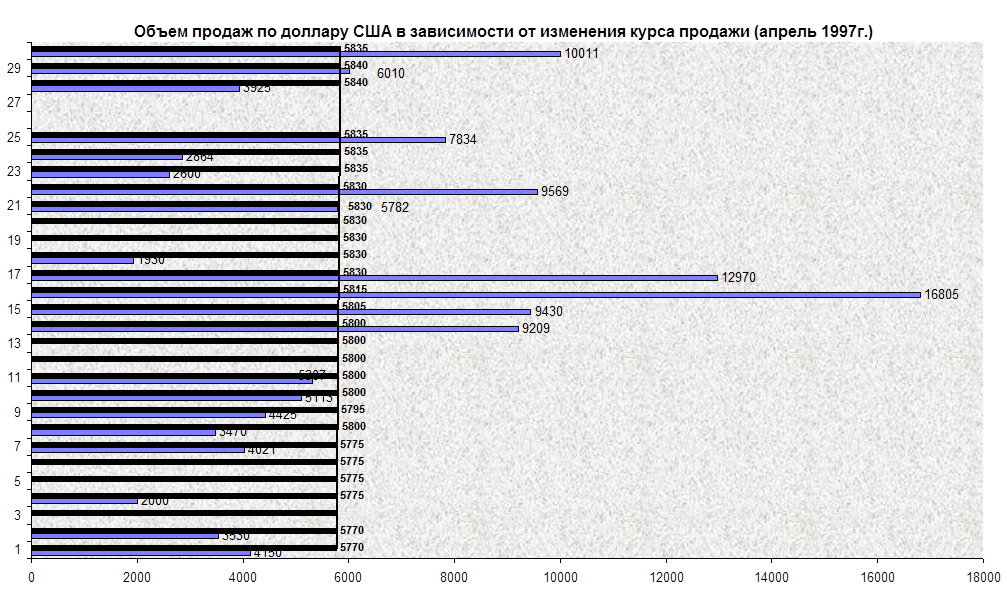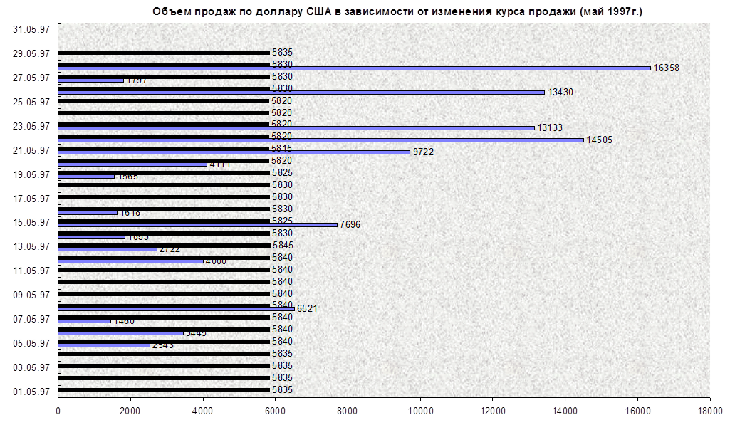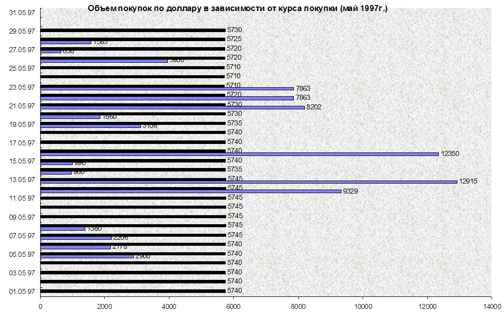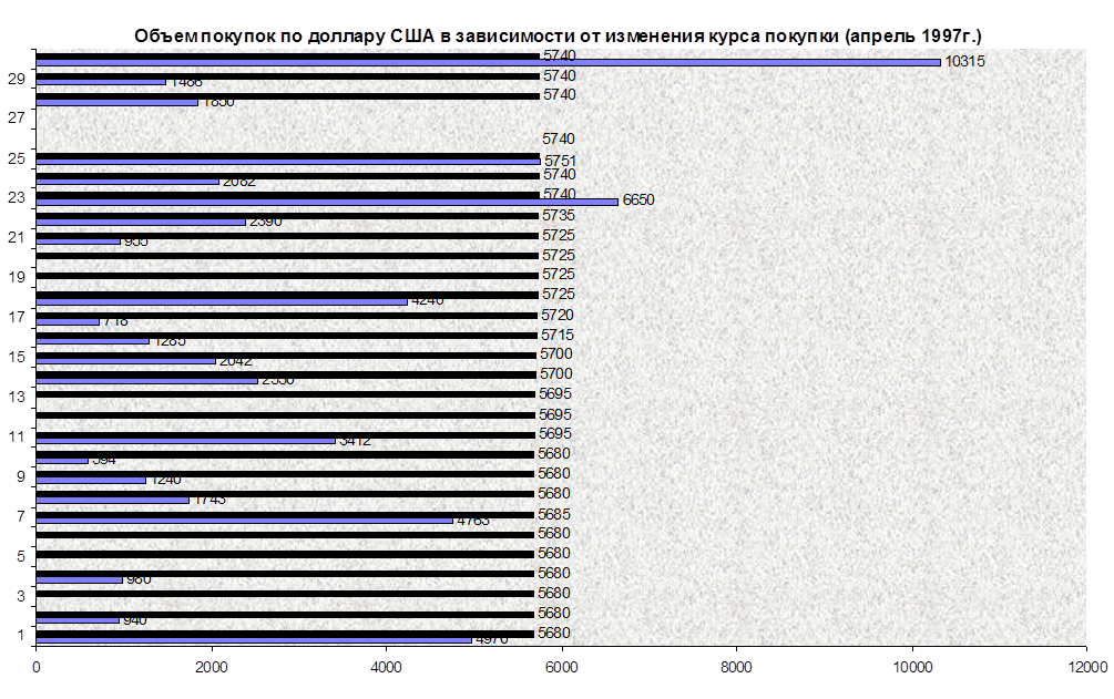 К тому же немаловажное значение на практике имеет то, что значительную роль в зависимости спроса от курса покупки-продажи иностранной валюты для конкретного банка играет только гораздо большая маржа по сравнению с банками конкурентами. При небольших диапазонах изменения банковских курсов в различных обменных пунктах наблюдается несовпадение теоретического вывода о высокой зависимости цены и спроса. Реальная картина, полученная на данных статистического анализа операций обменного пункта Некоторого Астраханского банка и приведенная на графиках подтверждает этот вывод. Объясняется это тем, что иностранная валюта не является предметом первой необходимости, и спрос на нее формируется в основном за счет внешних политических и экономических факторов, значительно возрастая к концу каждого года, оставаясь весьма высоким в начале года. Статистические данные также показывают, что средневзвешенный объем сделки не достигает той величины, когда клиент может получить значительную экономию средств или дополнительный доход, потратив время на поиски обменного пункта с наиболее выгодным курсом.