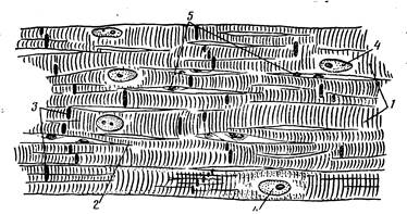 1 — миокардиоциты; 2 — анастомозы; 3 — вставочные участки; 4 — ядра миокардиоцитов; 5 — ядра эндотелия капилляров.