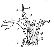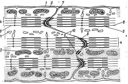 1 — сарколемма; 2 — плазмолемма; 3 — митохондрии; 4 — миофибрилла; 5 — миозиновые филаменты; б — актиновые филаменты; 7 — граница между миокардиоцитами; 8 — зона вплетения актиновых миофиламентов; 9 — десмосома; 10 — щелевой контакт; 11 — канальцы саркоплазматической сети.