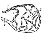 1 — артериола; 2 — венула; 3 — капиллярная сеть; 4 — артериоло-венулярный анастомоз