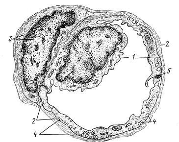 1 — эндотелиоцит: 2 — базальная мембрана; 3 — перицит; 4 — пиноцитозные микропузырьки; 5 — зона контакта между эндотелиальными клетками (рис. Козлова).