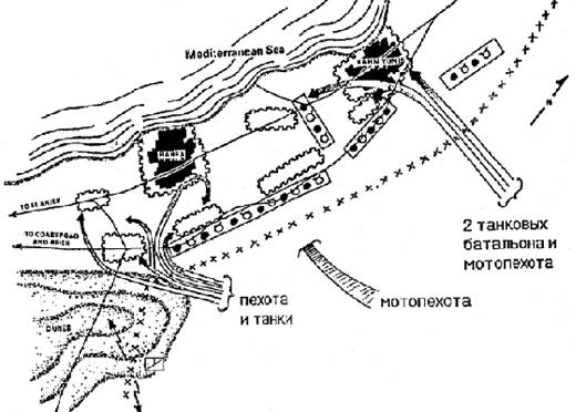 Характерным примером использования танковых частей для развития успеха является наступление Северной группы израильских войск на приморском направлении. Главный удар наносился частями левого фланга в тридцатикилометровый промежуток между 7-й и 2-й мотопехотными египетскими дивизиями, вспомогательный - в стык между 20-й пехотной и 7-й мотопехотной дивизиями. К вечеру группе удалось в районе Хан-Юнис прорваться на побережье Средиземного моря и отрезать 20-ю пехотную дивизию, а 7-ю дивизию с обоих флангов обойти. При этом две бронетанковые бригады развили наступление вдоль побережья и к исходу 6 июня окружили египетскую пехотную бригаду.