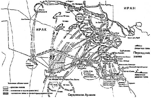 Характерным примером комплексного применения сил и средств сухопутных войск, в том числе бронетанковых, явилась наступательная операция "Меч пустыни". Ее замысел предусматривал нанесение ударов в трех направлениях: фронтального - по иракской обороне на границе Кувейта с Саудовской Аравией; на северо-восток - вдоль границы с Кувейтом; с запада - на восток в глубину обороны Ирака.