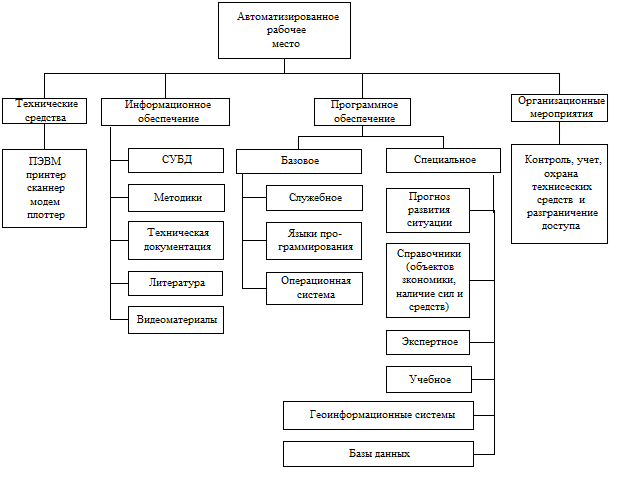 Автоматизированное рабочее место (АРМ), представляет собой место пользователя ПЭВМ, оборудованное средствами, необходимыми для автоматизации выполнения дежурным функций планирования и организации действий сил РСЧС. Такими средствами, как правило, является персональный компьютер, дополняемый по мере необходимости другими вспомогательными электронными устройствами (принтер, сканнер, модем).