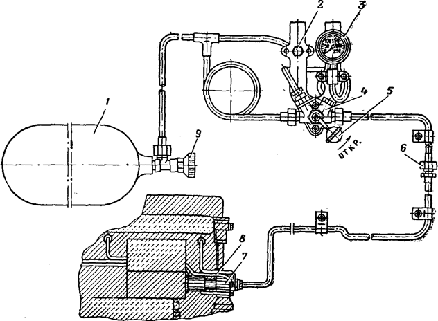1-баллон; 2-зарядный штуцер; 3 - манометр редуктора; 4 - редуктор- 5 - рукоятка редуктора; 6- разъемное устройство, используемое при консервации двигателя; 7 - воздухораспределитель; 8 - воздухопровод; 9 - запорный вентиль