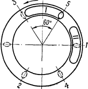 — переместить стрелку-указатель до ближайшего целого деления на шкале муфты, соединяющей двигатель с силовой передачей, разметить шкалу на шесть делений по 60° и пронумеровать их;