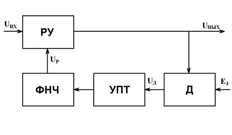 В АРУ с обратной связью выходное напряжения Uвых после детектора Д (Uд ) усиливается усилителем постоянного тока УПТ с коэффициентом усиления Купт и через фильтр низких частот ФНЧ, обеспечивающий инертность АРУ, регулирующее напряжение Uр таким образом изменяет коэффициент передачи регулируемого усилителя РУ, содержащего np регулируемых каскадов.