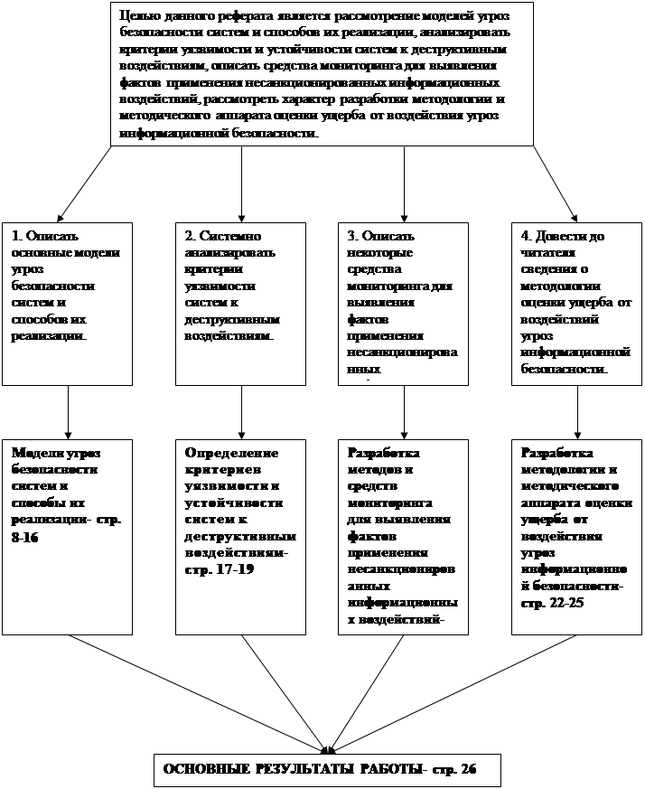 Целью данного реферата является рассмотрение моделей угроз безопасности систем и способов их реализации, анализировать критерии уязвимости и устойчивости систем к деструктивным воздействиям, описать средства мониторинга для выявления фактов применения несанкционированных информационных воздействий, рассмотреть характер разработки методологии и методического аппарата оценки ущерба от воздействия угроз информационной безопасности.
