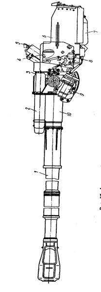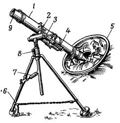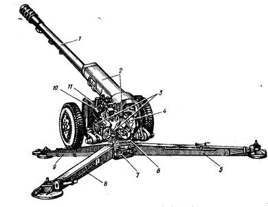 1- ствол, 2- люлька, 3- механізми наведення, 4- затвор, 5 і 8 – рухомі станини, 6 – верхній станок, 7- нижній станок, 9- нерухома станина, 10 – приціл, 11- щитове покриття.