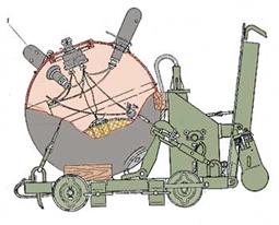 Разъемная крестовина состоит из нижней и верхней балок, на которых крепятся 4 стальных листа с помощью защелок. Для переноски мин к концам балок прикручены ручки, а для перекатывания мины имеются ролики, смонтированные на концах крестовины. В центре верхней балки вварен подпятник, служащий опорой подставке.