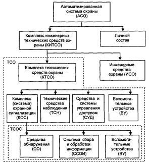 В общем случае в состав комплекса технических средств обеспечения безопасности объекта входят: технические средства охранной сигнализации; технические средства наблюдения; система контроля доступа, в литературе применяются также понятия-синонимы — система управления доступом и система контроля и управления доступом; технические средства пожарной сигнализации; технические средства обнаружения диверсионно-террористических средств и технические средства обнаружения утечки информации. В состав ТСОС входят: средства обнаружения; система сбора, обработки, отображения и документирования информации; вспомогательные устройства - системы электропитания, охранного освещения, оповещения и т.д.