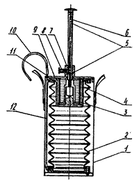 Воздухозаборное устройство УГ-2 состоит из резинового сильфона (2) с двумя фланцами, стакана с пружиной (3), находящихся внутри корпуса (1). Во внутренних гофрах сильфона установлены распорные кольца (4) для придания жесткости сильфону и сохранения постоянства объема. На верхней плате (9) имеется неподвижная втулка (7) для направления штока (6) при сжатии сильфона (2). На штуцер (11)с внутренней стороны надета трубка резиновая (12), которая через нижний фланец соединяется с внутренней полостью сильфона. Свободный конец трубки резиновой (10) служит для присоединения индикаторной трубки при анализе. На цилиндрической поверхности штока (6) расположены четыре продольные канавки с двумя углублениями (5) для фиксации двух положений штока фиксатором (8). Расстояние между углублениями на канавках подобрано таким образом, чтобы при ходе штока от одного углубления до другого сильфон забирал заданный объем исследуемого воздуха.