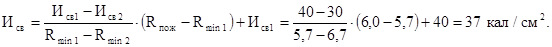 При Rmin1 =5,7 км, Исв1 = 40 кал/см2 , а при Rmin2 =6,7 км, Исв2 =30 кал/см2 . Интерполируя находим, что