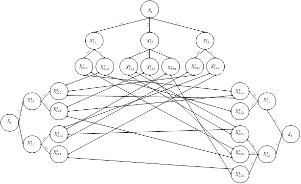 На примере рассматриваемой системы (рисунок 1) построение орграфа взаимосвязи осуществляется путем установления взаимосвязей между вершинами нижних уровней взвешенных орграфов боеспособности элементов системы (рисунок 3).