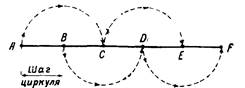Измерение длинных линий , не умещающихся на линейном масштабе карты, производится по частям. Для этого берут по масштабу раствор циркуля, соответствующий какому-нибудь целому числу километров или метров, и таким «шагом» проходят по карте определяемое протяжение, ведя счет перестановок ножек. Наиболее рациональный порядок перестановки ножек показан на рис. 3, где AF—измеряемая линия, А, В и т. д.—места постановки ножек. Стрелками показано направление перемещения ножек.