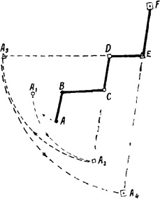 Для измерения извилистой линии шаг циркуля берется меньше (например, 0,5 см или 1 см), сообразно длине звеньев линии. Но более удобно измерение вести следующим образом (рис. 4). Пусть требуется измерить по карте расстояние по линии ABCDEF. Установив раствор циркуля по первому звену линии, т. е. по АВ, переставляем заднюю ножку в точку А1 (на продолжении следующего по ходу измерения звена ВС). Оставляя ее теперь на месте, т. е. в точке А1 , увеличиваем раствор циркуля перемещением передней его ножки в точку С. Затем, не изменяя положения передней ножки, заднюю из точки А1 переставляем в точку А2 (на продолжении третьего звена CD). После этого переднюю ножку перемещаем дальше в точку D и т. д., пока не пройдем таким образом всю линию. В итоге получим отрезок A4 F, равный искомой длине линии на карте. Остается, не изменяя полученного раствора циркуля, перенести его на линейный масштаб или миллиметровую линейку и определить расстояние, как было указано выше.