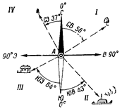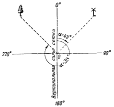 На рис. 20 показаны дирекционные углы в данной точке О (полюс) на ветряную мельницу (а =45°) и отдельное дерево (а =315°).