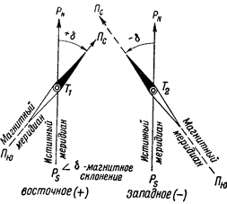 Истинный меридиан в свою очередь не совпадает с магнитным меридианом. Угол между одноименными направлениями истинного и магнитного меридианов называется магнитным склонением и обозначается греческой буквой δ (дельта). Склонение считается восточным (со знаком +), если северный конец стрелки уклоняется к востоку от истинного меридиана, и западным (со знаком —) при уклонении к западу (рис. 12).