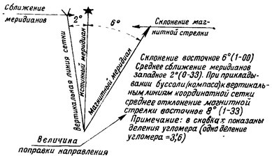 Данные о величине поправки направления и слагающих ее величинах сближения меридианов и магнитного склонения помещаются в виде схемы на полях карты, под нижней стороной ее рамки (рис. 13). Эти данные о поправке направления необходимы для того, чтобы можно было быстро переходить от дирекционных углов, измеренных по карте, к соответствующим им магнитным азимутам и обратно.