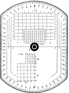 Измерение и построение дирекционных углов на карте производится с помощью транспортира или артиллерийского круга. Последний представляет собой (рис. 14) целлулоидную пластинку, по внешнему срезу которой нанесена угломерная шкала в делениях угломера. Цена деления 0-10. Большие деления, соответствующие 1-00, оцифрованы от 0 до 60, при этом ряд красных цифр нанесен в возрастающем порядке по ходу часовой стрелки, а ряд черных цифр—в обратном порядке.