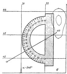 Чтобы измерить на карте дирекционный угол какого-нибудь направления, надо наложить на нее транспортир так, чтобы середина его линейки, отмеченная штрихом, совпала с точкой пересечения определяемого направления с вертикальной километровой линией сетки, а край линейки (т. е. деления 0 и 180° на транспортире) совместился с этой линией. Затем отсчитать по шкале транспортира угол по ходу часовой стрелки от северного направления километровой линии до определяемого направления (рис. 15,а).