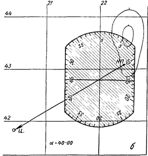 При измерении дирекционного угла артиллерийским кругом надо, наложив центр круга на точку пересечения определяемого направления с вертикальной километровой линией сетки, совместить нулевой штрих круга с северным направлением этой километровой линии, как показано на рис. 15,б. Величину дирекционного угла получим, взяв отсчет по шкале круга против определяемого направления, пользуясь при этом красной (т. е. возрастающей по ходу часовой стрелки) оцифровкой делений.
