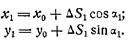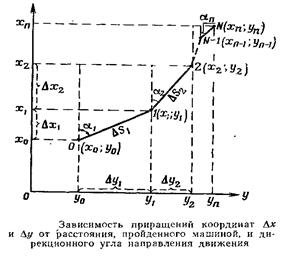 Таким образом, текущие координаты движущейся машины равны алгебраической сумме координат начальной точки и приращений Ах и Ау, вычисленных аппаратурой в процессе движения машины от начальной точки до данной.