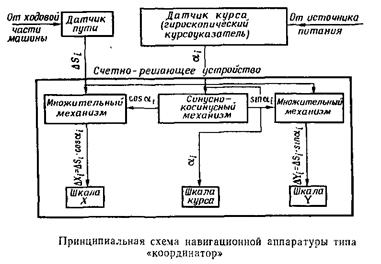 До начала движения машины на шкале «Курс» устанавливают отсчет, равный дирекционному углу а продольной оси машины. При изменении направления оси машины в процессе движения датчик курса подает в счетно-решающее устройство электрический сигнал, пропорциональный изменению курса.