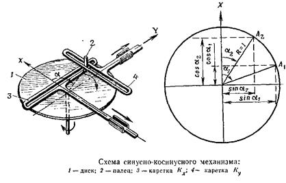 Синусно-косинусный механизм автоматически определяет численные значения синуса и косинуса дирекционного угла направления движения машины. Он представляет собой поворачивающийся диск, на котором укреплен палец, связанный с двумя каретками Кх и Ку. В целях ввода корректуры пути расстояние между центром диска и пальцем может меняться.